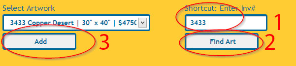 The second way to select art is to enter your inventory number into the "Shortcut" field. If you know your artwork inventory number (this is the number you assigned to the piece when entering the artwork into ARTsala), you can simply enter it here, click "Find Art". ARTsala will find the art for you and select it in the "Select Art" drop-down menu. Click the "Add" button and your art will appear below in the invoice.