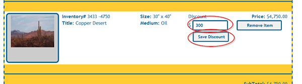 Discounts. If you are giving your client a discount, you will enter the discount for each individual piece of artwork. This allows you to control your discounts on a piece by piece basis. Enter the dollar amount of the discount and click on the "Save Discount" button.